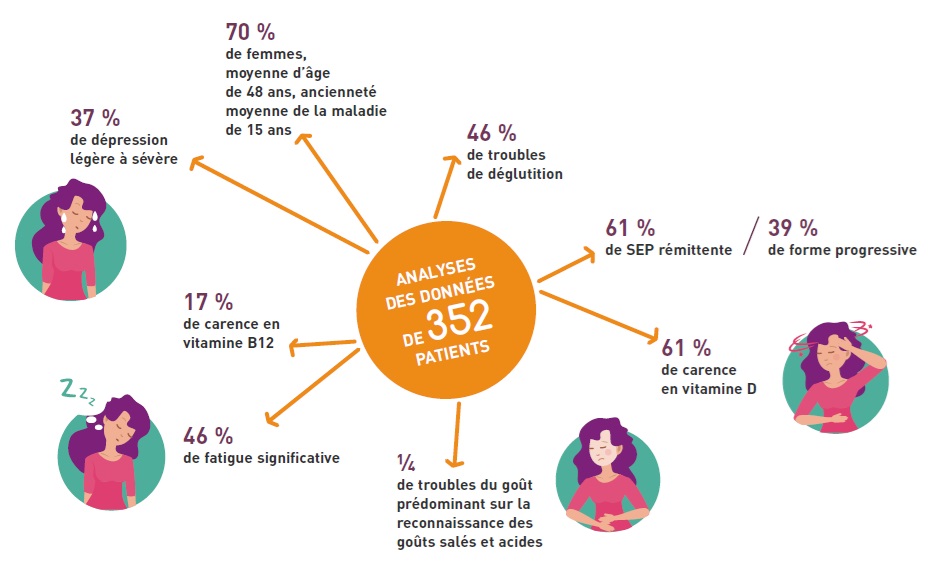 L’objectif était de rechercher le lien entre la fatigue évaluée par le questionnaire EMIF-SEP (Échelle Modifiées d’Impact de la Fatigue dans la Sclérose En Plaques (SEP)) et l’état nutritionnel des patients atteints de SEP. L’hypothèse du projet est que les carences nutritionnelles, consécutives aux troubles du comportement alimentaire, et en rapport avec des troubles de la déglutition et du goût, peuvent être impliquées dans la physiopathologie de la fatigue.